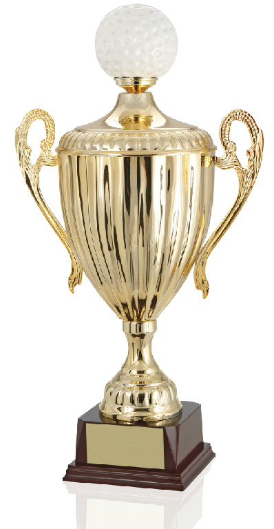 30″ Tall Gold Plated Cup with a Ceramic Golf Ball Figure on Mahogany Finish Wood Base.